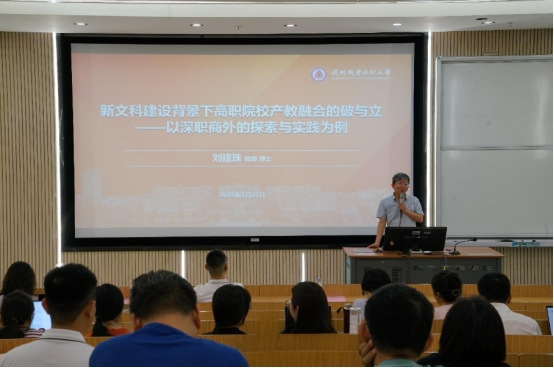 最后,副院长(主持工作)刘建珠表示,新文科背景下高职院校需聚焦五大关键办学能力——专业对标产业、课程重构能力图谱、教材融入行业标准、师资跨界融合、实训打造生态场景。而产教融合机制恰是贯穿这五大要素的底层逻辑。他呼吁教师深入企业调研,重构课程体系,同时探索校企共建生产经营活动的可行路径。会议还提出需优化评价机制,激发师生教与学的积极性。
