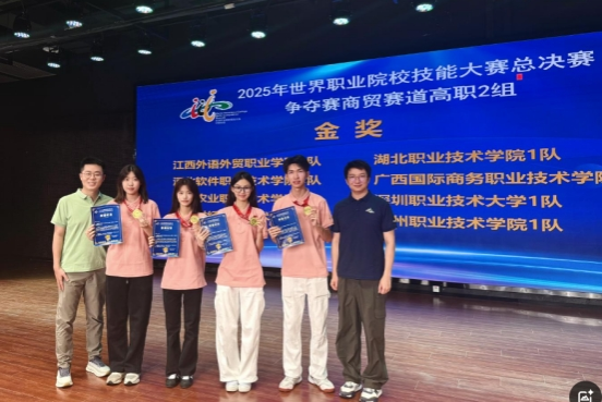 8月27日至28日,2025年世界职业院校技能大赛“商贸赛道”高职组争夺赛在陕西赛区举行。我校商外学院学生欧婷玉、郭雪芬、黄梓佳、邱志杰,在指导老师邓灵昭、陈航的悉心指导下,凭借扎实的专业技能和出色的团队协作,在陕西工业职业技术大学赛点脱颖而出,勇夺金奖。