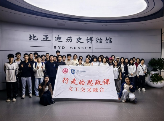 为深化“外语+X”复合型人才培养,用好社会“大课堂”,打造“行走的思政课”品牌,近日,商外学院25应德、应法班级同学在班主任马丽丽、辅导员刘佩玉的带领下,前往比亚迪历史博物馆开展“行走的思政课”实践活动,通过实地走访、企业参访与现场教学,将课堂延伸到产业一线。