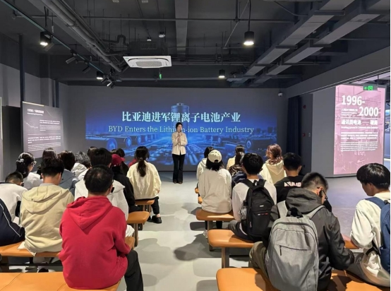 从1994年起步于电池制造,到如今成为横跨汽车、新能源、轨道交通等领域的科技巨头,比亚迪31年的发展史正是“深圳精神”的生动诠释。博物馆内一幅以300个精彩故事浓缩企业发展历程的“筑梦图”,从“电池制造”到“千亿产业”,透过“1000万辆新能源车下线”的里程碑、2023年全球总部建设启动等关键节点,展现了比亚迪坚守实业、创新突围的奋斗历程,同学们切身感受了中国制造向中国智造的崛起之路。讲解员深情讲述了企业从转型造车时的破釜沉舟,到2015年推出全球首台纯电动大巴的技术飞跃,特别是“哪怕只有1%的可能,也要付出100%努力”的企业信念,以及通过“人海战术”开拓国际市场的创业艰辛,让同学们深刻体会到“拼搏精神”已融入深圳企业的基因血脉,成为特区建设者用实干书写的时代注脚。