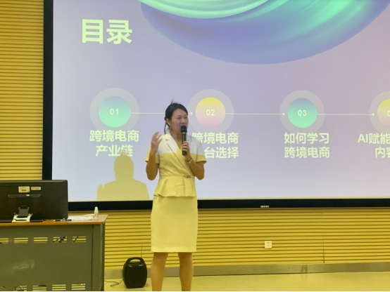 在专题分享环节,李延婷立足全球视野,从产业生态、平台运营、能力培养、技术创新四个维度展开深度解析。通过详实的数据图表,她剖析了全球跨境电商产业链的演进脉络与区域发展特征,重点解读了粤港澳大湾区跨境电商发展的政策优势与市场机遇。针对学生普遍关注的职业发展问题,李博士结合头部平台运营案例,系统讲解了亚马逊、阿里巴巴国际站等主流平台的运营策略与选品逻辑。在谈到AI技术应用时,她现场演示了智能选品系统与AI内容生成工具的操作流程,并表示“人机协同”将成为行业核心竞争能力。