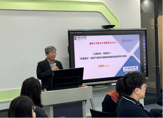 刘建珠对两位主任的汇报进行了点评,并作题为《以赛促学、技能育人:“岗课赛证”视域下高职外语赛教融通机制的探索与实践》的专题报告。他从“岗课赛证、以赛促学、以赛促教、以赛促改”四个维度,深入探讨了高职外语如何通过系统化设计,将面向少数学生的“精英化”竞赛,转化为惠及全体学生的“普惠性”能力成长机制。刘院长指出,关键在于以系统设计、改革魄力与教育匠心,将竞赛所承载的实践精神与创新机制,深度融入教学全环节,真正实现赛教融合、赋能全员。(商外学院 李舰君)